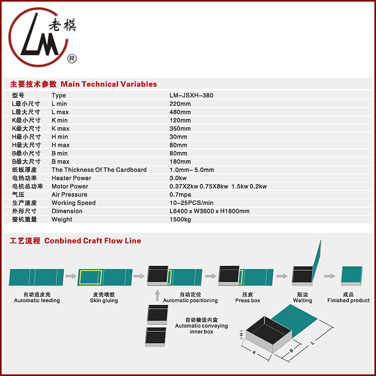 可用于不同形狀禮盒貼邊,多種規格貼邊成型。適用范圍廣。禮品盒上膠組裝機專門針對精品煙包盒、化妝品盒及各種高檔禮盒自動送料、上膠、定位、壓盒、貼邊的禮盒組裝貼邊一體機。采用輕量型材機架,專門針對精品煙包盒、化妝品盒及各種高檔禮盒自動送料、上膠、定位、壓盒、貼邊的禮盒組裝貼邊一體機。采用輕量型材機架。外形美觀結構穩定。